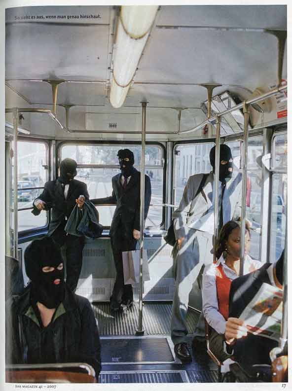 Für einen Artikel zum Thema "Abzocker" im Magazin des Tagesanzeigers wird diese Fotoserie fotografiert. Ohne offizielle Erlaubnis werden an 10zehnOrten in der Stadt Zürich zehn vermummte Statisten inszeniert und fotografiert.