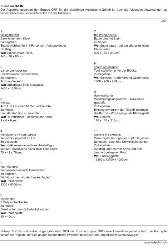 Kunst am Ort ist ein Projekt, das im Rahmen der Kunstszene Zürich stattgefunden hat. Am Messestand verteilt ortsofort Galerien-Werkverzeichnisse mit zehn detailliert beschriebenen Kunstwerken. Auf einem A4 Blatt sind Orte in Zürich beschrieben, die erst durch die Umbenennung und neue Anschauung zu "Kunstwerken" werden. Der Besucher ist aufgefordert, die Orte/Kunstwerke in der Stadt selber zu finden und zu erleben.